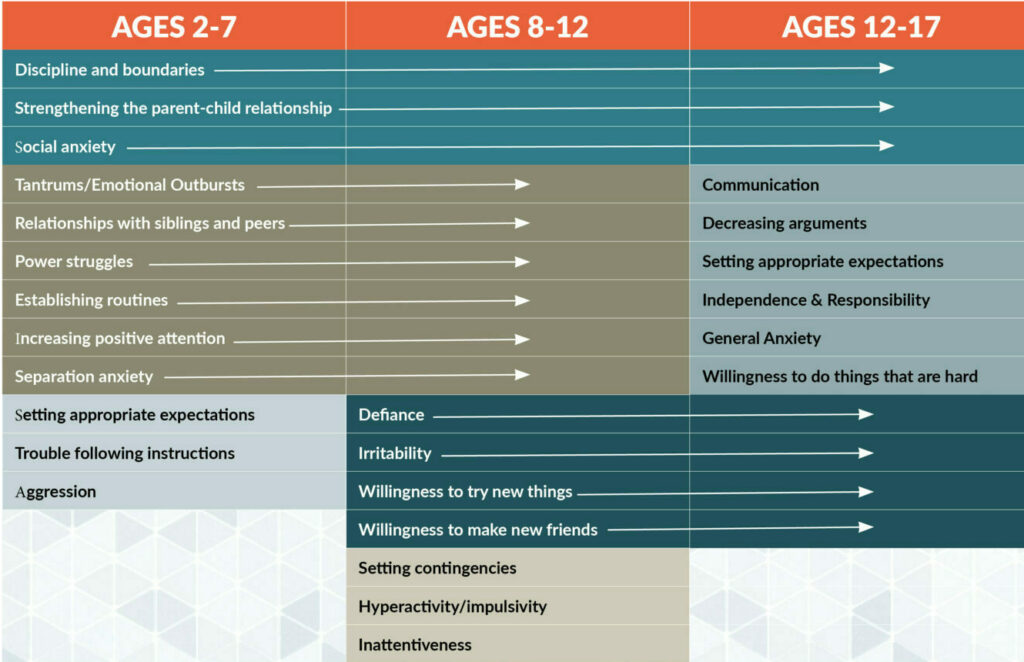 As children grow, the delivery of BPT evolves, though the core concepts remain largely consistent. This chart identifies the issues most commonly addressed in various age ranges: